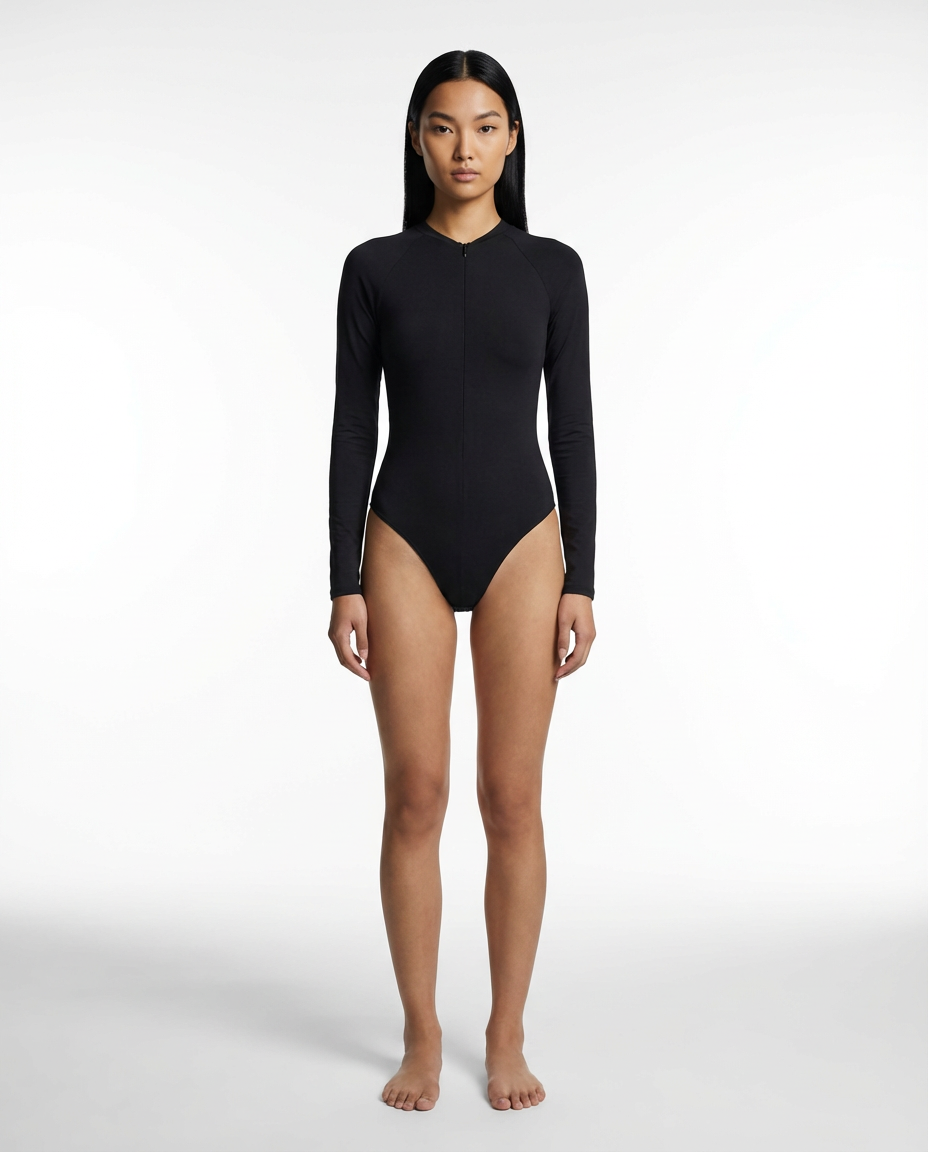The ultimate base layer. This ribbed long-sleeve bodysuit features a functional front zip and a sleek, form-fitting silhouette that hugs your curves.